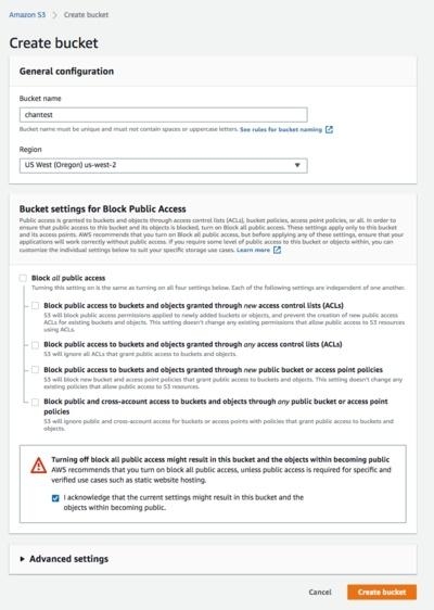 (Vô cùng quan trọng) - Bỏ chọn Block all public access - (Đảm bảo bỏ chọn phần này nếu bạn muốn upload hình ảnh hoặc bất kỳ file nào bạn muốn hiển thị công khai. Nếu không, trong tương lai khi bạn muốn lấy các file của bạn, bạn sẽ gặp lỗi).
