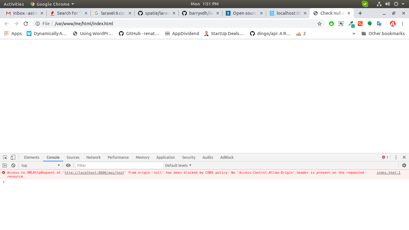 One my viewer sent me a message with screen shot "Access to XMLHttpRequest at 'http://localhost:8000/api/users' from origin 'null' has been blocked by CORS policy: No 'Access-Control-Allow-Origin' header is present on the requested resource." and he was told me when i was access my api from other project then it is show me error like this way.