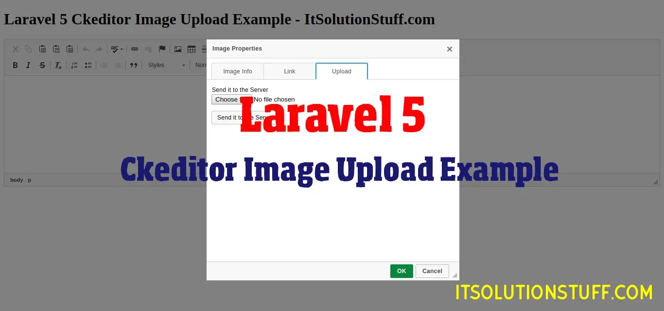 We will use filebrowseruploadurl and filebrowserUploadMethod function of ckeditor in laravel 5. so if you have ckeditor image upload not working in laravel then i will hep you to how to upload image using ckeditor in laravel.