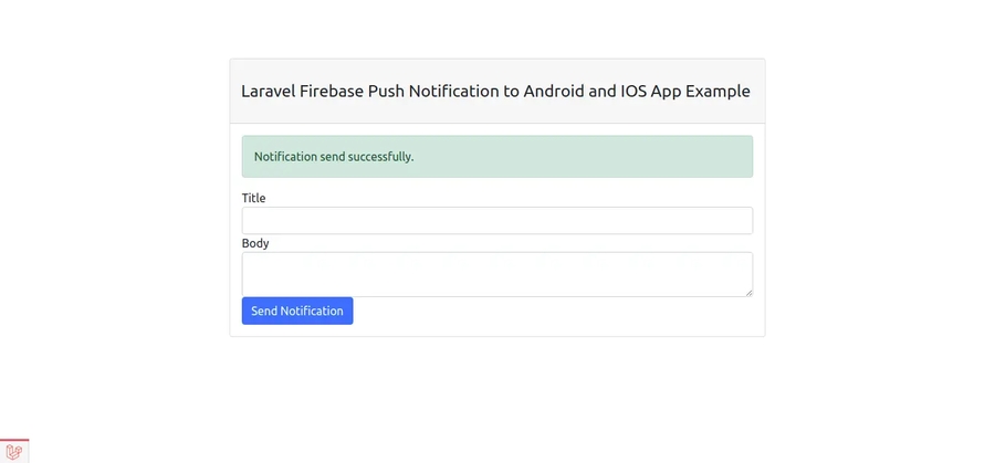 <!DOCTYPE html><html><head> <meta charset="utf-8"> <title>Laravel Firebase Push Notification to Android and IOS App Example - ItSolutionStuff.com</title> <link href="https://cdn.jsdelivr.net/npm/bootstrap@5.0.2/dist/css/bootstrap.min.css" rel="stylesheet"></head><body> <br/><div class="container"> <div class="row justify-content-center"> <div class="col-md-8"> <div class="card"> <div class="card-header">{{ __('Dashboard') }}</div> <div class="card-body"> @if (session('success')) <div class="alert alert-success" role="alert"> {{ session('success') }} </div> @endif <form action="{{ route('send.notification') }}" method="POST"> @csrf <div class="form-group"> <label>Title</label> <input type="text" class="form-control" name="title"> </div> <div class="form-group"> <label>Body</label> <textarea class="form-control" name="body"></textarea> </div> <button type="submit" class="btn btn-primary">Send Notification</button> </form> </div> </div> </div> </div></div></body></html>Run Laravel App: