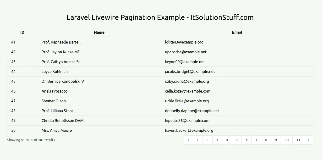 <?php namespace App\Http\Livewire; use Livewire\Component;use Livewire\WithPagination;use App\Models\User; class UserPagination extends Component{ use WithPagination; /** * Write code on Method * * @return response() */ public function render() { return view('livewire.user-pagination', [ 'users' => User::paginate(10), ]); }}