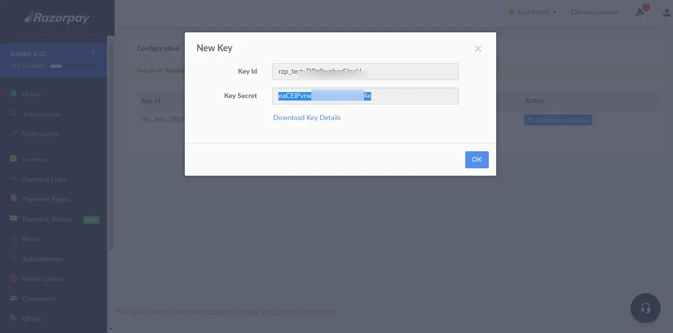 First you need to create account on razorpay. then you can easily get account key id and key secret.