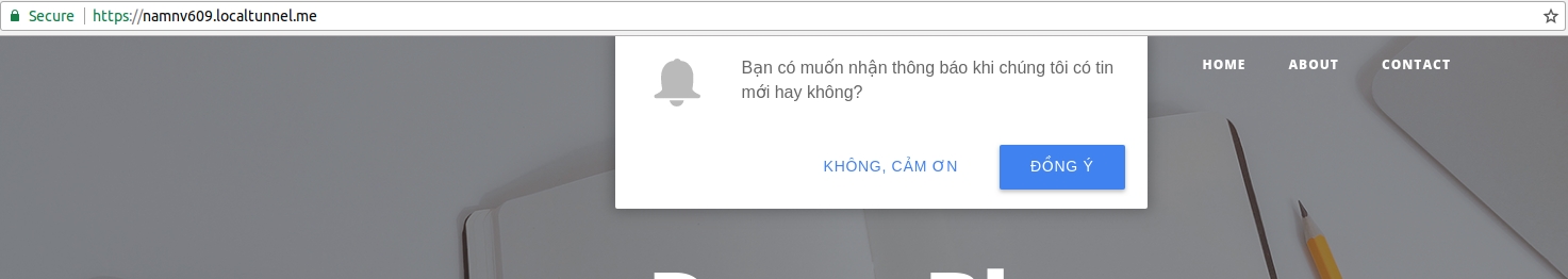 php artisan serveVà bật LocalTunnel. Đưa port 8000 ra với subdomain bạn tự chọn (và đã sử dụng để cài đặt ở OneSignal – ở đây mình dùng subdomain là namnv609):