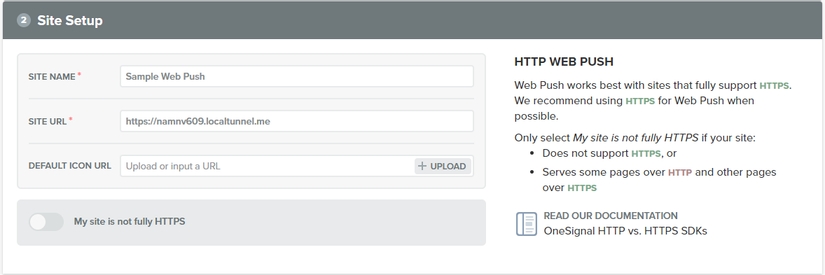 Trong phần Configure web push, tại mục Choose Integration ta chọn Custom code, tại phần Site Setup ta nhập thông tin dạng như sau (mọi người hãy sửa lại cho phù hợp nhé):