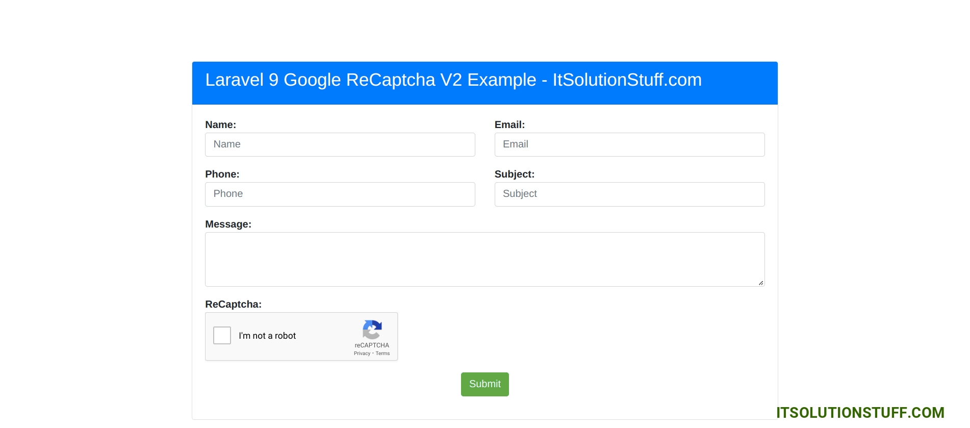 <!DOCTYPE html><html><head> <title>Laravel Google ReCaptcha V2 Example - ItSolutionStuff.com</title> <meta charset="utf-8"> <meta http-equiv="X-UA-Compatible" content="IE=edge"> <meta name="viewport" content="width=device-width, initial-scale=1"> <link rel="stylesheet" href="https://cdnjs.cloudflare.com/ajax/libs/twitter-bootstrap/4.5.2/css/bootstrap.min.css" /> <script src='https://www.google.com/recaptcha/api.js'></script></head><body> <div class="container"> <div class="row mt-5 mb-5"> <div class="col-10 offset-1 mt-5"> <div class="card"> <div class="card-header bg-primary"> <h3 class="text-white">Laravel Google ReCaptcha V2 Example - ItSolutionStuff.com</h3> </div> <div class="card-body"> <form method="POST" action="{{ route('contact.us.store') }}"> {{ csrf_field() }} <div class="row"> <div class="col-md-6"> <div class="form-group"> <strong>Name:</strong> <input type="text" name="name" class="form-control" placeholder="Name" value="{{ old('name') }}"> @if ($errors->has('name')) <span class="text-danger">{{ $errors->first('name') }}</span> @endif </div> </div> <div class="col-md-6"> <div class="form-group"> <strong>Email:</strong> <input type="text" name="email" class="form-control" placeholder="Email" value="{{ old('email') }}"> @if ($errors->has('email')) <span class="text-danger">{{ $errors->first('email') }}</span> @endif </div> </div> </div> <div class="row"> <div class="col-md-6"> <div class="form-group"> <strong>Phone:</strong> <input type="text" name="phone" class="form-control" placeholder="Phone" value="{{ old('phone') }}"> @if ($errors->has('phone')) <span class="text-danger">{{ $errors->first('phone') }}</span> @endif </div> </div> <div class="col-md-6"> <div class="form-group"> <strong>Subject:</strong> <input type="text" name="subject" class="form-control" placeholder="Subject" value="{{ old('subject') }}"> @if ($errors->has('subject')) <span class="text-danger">{{ $errors->first('subject') }}</span> @endif </div> </div> </div> <div class="row"> <div class="col-md-12"> <div class="form-group"> <strong>Message:</strong> <textarea name="message" rows="3" class="form-control">{{ old('message') }}</textarea> @if ($errors->has('message')) <span class="text-danger">{{ $errors->first('message') }}</span> @endif </div> </div> </div> <div class="row"> <div class="col-md-12"> <div class="form-group"> <strong>ReCaptcha:</strong> <div class="g-recaptcha" data-sitekey="{{ env('GOOGLE_RECAPTCHA_KEY') }}"></div> @if ($errors->has('g-recaptcha-response')) <span class="text-danger">{{ $errors->first('g-recaptcha-response') }}</span> @endif </div> </div> </div> <div class="form-group text-center"> <button class="btn btn-success btn-submit">Submit</button> </div> </form> </div> </div> </div> </div> </div></body></html>Run Laravel App: