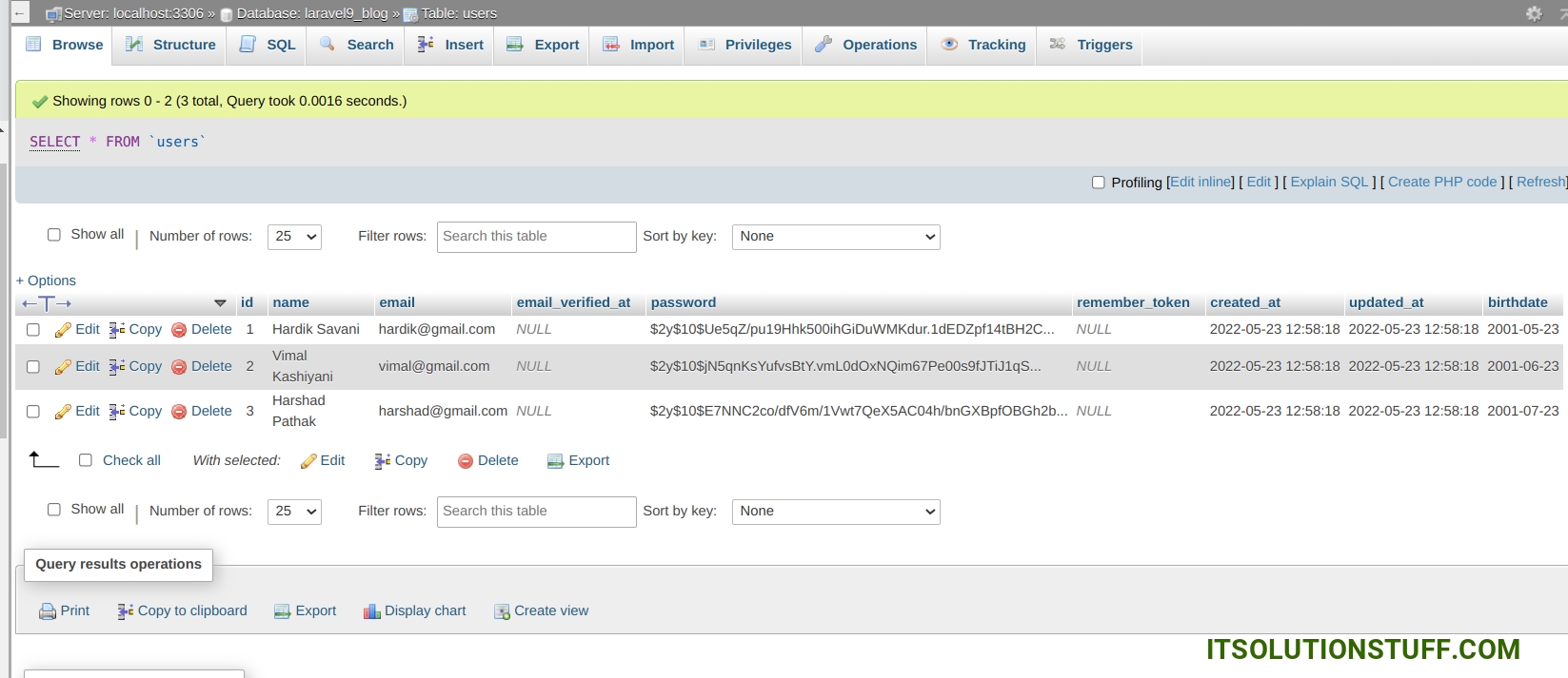 <?php namespace Database\Seeders; use Illuminate\Database\Console\Seeds\WithoutModelEvents;use Illuminate\Database\Seeder;use App\Models\User; class UserSeeder extends Seeder{ /** * Run the database seeds. * * @return void */ public function run() { $users = [ [ "name" => "Hardik Savani", "email" => "hardik@gmail.com", "password" => bcrypt("123456"), "birthdate" => "2001-05-23" ], [ "name" => "Vimal Kashiyani", "email" => "vimal@gmail.com", "password" => bcrypt("123456"), "birthdate" => "2001-06-23" ], [ "name" => "Harshad Pathak", "email" => "harshad@gmail.com", "password" => bcrypt("123456"), "birthdate" => "2001-07-23" ] ]; foreach ($users as $key => $value) { User::create($value); } }}Then run below seeder to create dummy users.