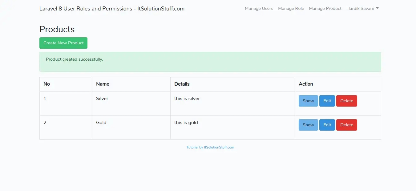 @extends('layouts.app')@section('content') <div class="row"> <div class="col-lg-12 margin-tb"> <div class="pull-left"> <h2> Show Product</h2> </div> <div class="pull-right"> <a class="btn btn-primary" href="{{ route('products.index') }}"> Back</a> </div> </div> </div> <div class="row"> <div class="col-xs-12 col-sm-12 col-md-12"> <div class="form-group"> <strong>Name:</strong> {{ $product->name }} </div> </div> <div class="col-xs-12 col-sm-12 col-md-12"> <div class="form-group"> <strong>Details:</strong> {{ $product->detail }} </div> </div> </div>@endsection<p class="text-center text-primary"><small>Tutorial by ItSolutionStuff.com</small></p>Step 10: Create Seeder For Permissions and AdminUser