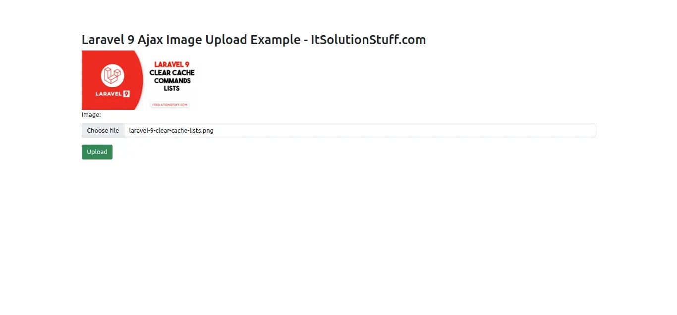 <!DOCTYPE html><html><head> <title>Laravel 9 Ajax Image Upload Example - ItSolutionStuff.com</title> <link href="https://cdn.jsdelivr.net/npm/bootstrap@5.0.2/dist/css/bootstrap.min.css" rel="stylesheet"> <script src="https://cdnjs.cloudflare.com/ajax/libs/jquery/3.6.0/jquery.min.js" integrity="sha512-894YE6QWD5I59HgZOGReFYm4dnWc1Qt5NtvYSaNcOP+u1T9qYdvdihz0PPSiiqn/+/3e7Jo4EaG7TubfWGUrMQ==" crossorigin="anonymous" referrerpolicy="no-referrer"></script></head> <body><div class="container"> <div class="panel panel-primary"> <div class="panel-heading"> <h2>Laravel 9 Ajax Image Upload Example - ItSolutionStuff.com</h2> </div> <div class="panel-body"> <img id="preview-image" width="300px"> <form action="{{ route('image.store') }}" method="POST" id="image-upload" enctype="multipart/form-data"> @csrf <div class="mb-3"> <label class="form-label" for="inputImage">Image:</label> <input type="file" name="image" id="inputImage" class="form-control"> <span class="text-danger" id="image-input-error"></span> </div> <div class="mb-3"> <button type="submit" class="btn btn-success">Upload</button> </div> </form> </div> </div></div></body> <script type="text/javascript"> $.ajaxSetup({ headers: { 'X-CSRF-TOKEN': $('meta[name="csrf-token"]').attr('content') } }); $('#inputImage').change(function(){ let reader = new FileReader(); reader.onload = (e) => { $('#preview-image').attr('src', e.target.result); } reader.readAsDataURL(this.files[0]); }); $('#image-upload').submit(function(e) { e.preventDefault(); let formData = new FormData(this); $('#image-input-error').text(''); $.ajax({ type:'POST', url: "{{ route('image.store') }}", data: formData, contentType: false, processData: false, success: (response) => { if (response) { this.reset(); alert('Image has been uploaded successfully'); } }, error: function(response){ $('#image-input-error').text(response.responseJSON.message); } }); }); </script> </html>Run Laravel App:
