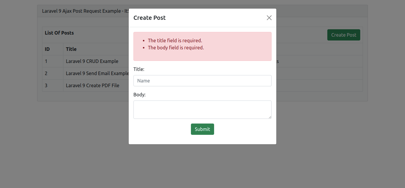In this example, we will create a "posts" table with a title and body column. we will list all posts data and add create button there. when you click on create button we will open the model where you can create a new post using a jquery ajax request. so basically you can fire an ajax post request with a bootstrap model.
