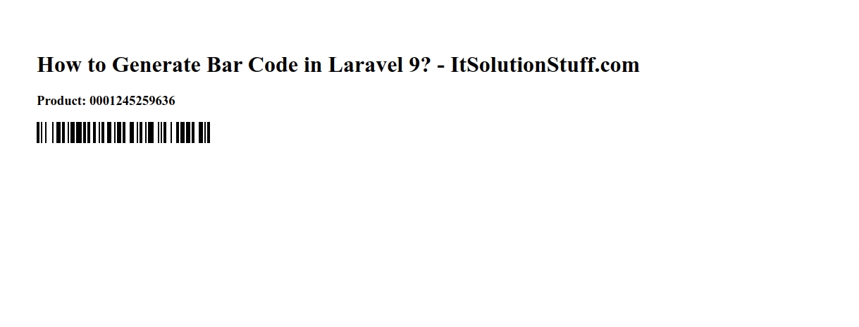 <!DOCTYPE html><html><head> <title>How to Generate Bar Code in Laravel? - ItSolutionStuff.com</title></head><body> <h1>How to Generate Bar Code in Laravel 9? - ItSolutionStuff.com</h1> <h3>Product: 0001245259636</h3> {!! $barcode !!} </body></html>Output: