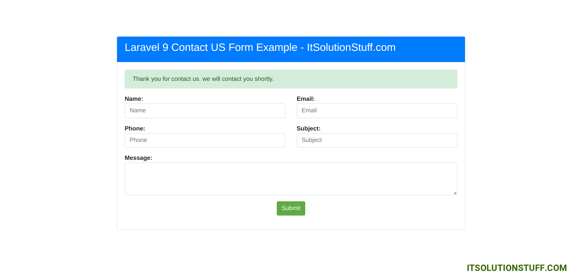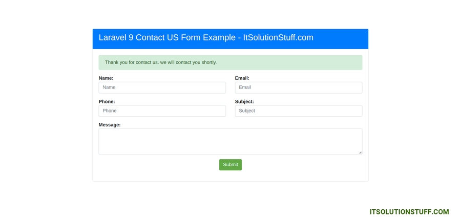 In this example, we will create a contact us form with name, email, phone, subject, and message. we will also add form validation for the contact form. After submitting the form we will store data in the database and send an email notification to the admin email. so let's follow the below step to make this example.