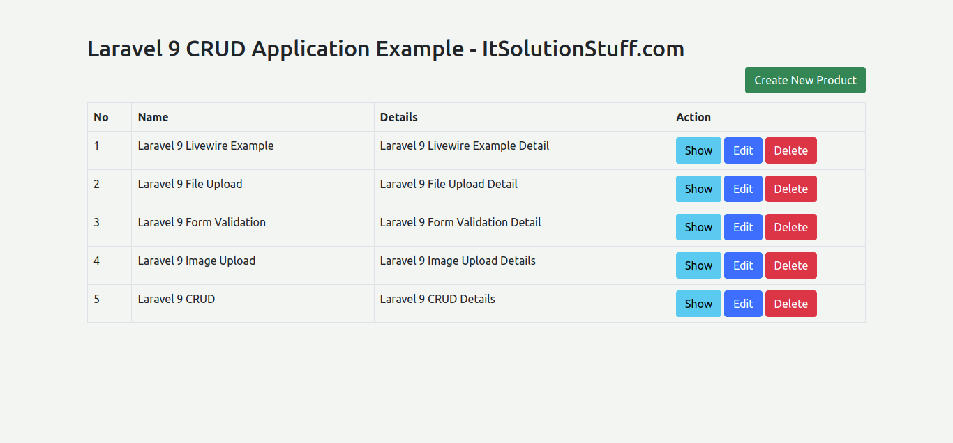 In this example, we will create a product crud application using laravel 9. we will create a products table with name and detail column using laravel 9 migration, then we will create routes, controller, view, and model files for the product module. we will use bootstrap 5 for design now. so let's follow the below step to create a crud operation with laravel 9.
