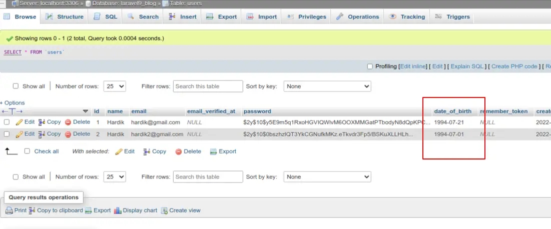 <?php namespace App\Http\Controllers; use Illuminate\Http\Request;use App\Models\User; class UserController extends Controller{ /** * Write code on Method * * @return response() */ public function create() { $input = [ 'name' => 'Hardik', 'email' => 'hardik2@gmail.com', 'password' => bcrypt('123456'), 'date_of_birth' => '07/21/1994' ]; $user = User::create($input); dd($user); } /** * Write code on Method * * @return response() */ public function show() { $user = User::first(); dd($user->toArray()); }}