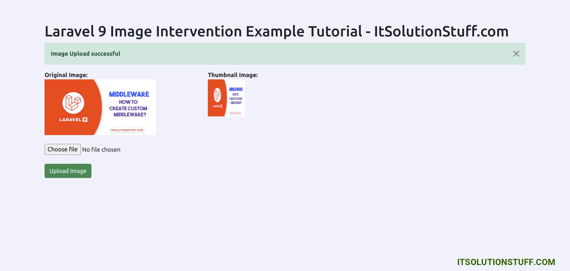 <!DOCTYPE html><html><head> <title>Laravel Image Intervention Example Tutorial - ItSolutionStuff.com</title> <link href="https://cdnjs.cloudflare.com/ajax/libs/twitter-bootstrap/5.0.1/css/bootstrap.min.css" rel="stylesheet"></head><body> <div class="container"> <h1>Laravel Image Intervention Example Tutorial - ItSolutionStuff.com</h1> @if (count($errors) > 0) <div class="alert alert-danger"> <strong>Whoops!</strong> There were some problems with your input.<br><br> <ul> @foreach ($errors->all() as $error) <li>{{ $error }}</li> @endforeach </ul> </div> @endif @if ($message = Session::get('success')) <div class="alert alert-success alert-dismissible fade show" role="alert"> <strong>{{ $message }}</strong> <button type="button" class="btn-close" data-bs-dismiss="alert" aria-label="Close"></button> </div> <div class="row"> <div class="col-md-4"> <strong>Original Image:</strong> <br/> <img src="/images/{{ Session::get('imageName') }}" width="300px" /> </div> <div class="col-md-4"> <strong>Thumbnail Image:</strong> <br/> <img src="/thumbnail/{{ Session::get('imageName') }}" /> </div> </div> @endif <form action="{{ route('image.store') }}" method="post" enctype="multipart/form-data"> @csrf <div class="row"> <div class="col-md-12"> <br/> <input type="file" name="image" class="image"> </div> <div class="col-md-12"> <br/> <button type="submit" class="btn btn-success">Upload Image</button> </div> </div> </form></div> </body></html>Run Laravel App: