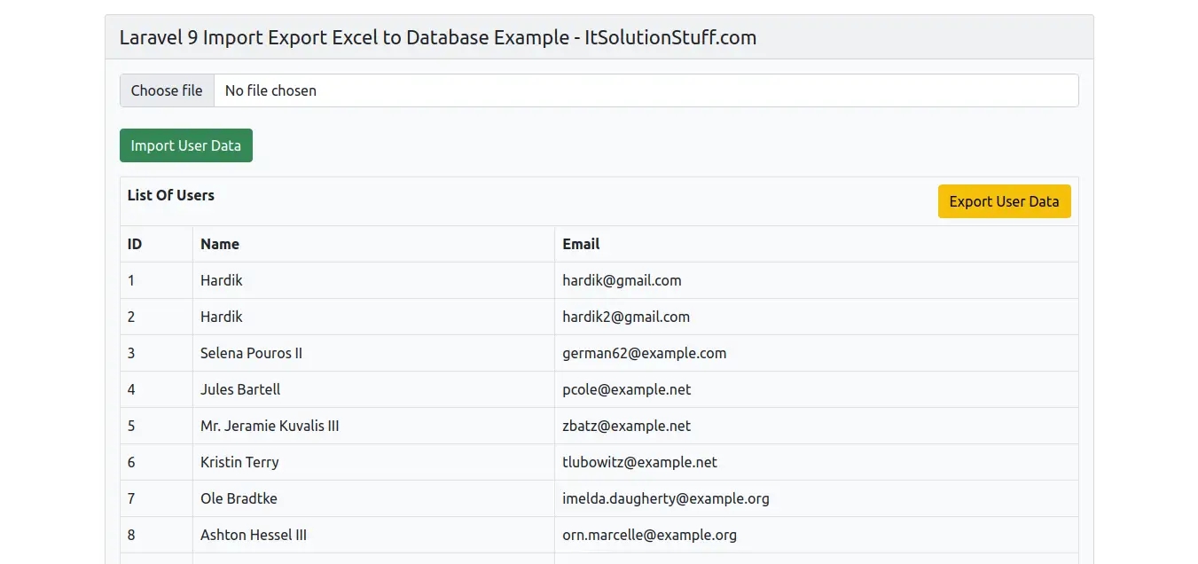 <!DOCTYPE html><html><head> <title>Laravel 9 Import Export Excel to Database Example - ItSolutionStuff.com</title> <link href="https://cdn.jsdelivr.net/npm/bootstrap@5.0.2/dist/css/bootstrap.min.css" rel="stylesheet"></head><body> <div class="container"> <div class="card bg-light mt-3"> <div class="card-header"> Laravel 9 Import Export Excel to Database Example - ItSolutionStuff.com </div> <div class="card-body"> <form action="{{ route('users.import') }}" method="POST" enctype="multipart/form-data"> @csrf <input type="file" name="file" class="form-control"> <br> <button class="btn btn-success">Import User Data</button> </form> <table class="table table-bordered mt-3"> <tr> <th colspan="3"> List Of Users <a class="btn btn-warning float-end" href="{{ route('users.export') }}">Export User Data</a> </th> </tr> <tr> <th>ID</th> <th>Name</th> <th>Email</th> </tr> @foreach($users as $user) <tr> <td>{{ $user->id }}</td> <td>{{ $user->name }}</td> <td>{{ $user->email }}</td> </tr> @endforeach </table> </div> </div></div> </body></html>Run Laravel App: