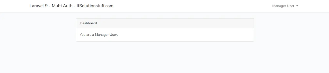 @extends('layouts.app')@section('content')<div class="container"> <div class="row justify-content-center"> <div class="col-md-8"> <div class="card"> <div class="card-header">{{ __('Dashboard') }}</div> <div class="card-body"> You are a Manager User. </div> </div> </div> </div></div>@endsectionStep 9: Update on LoginController