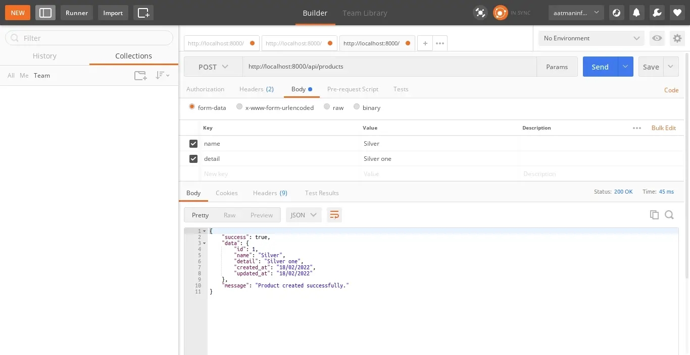4) Product Create API: Verb:POST, URL:http://localhost:8000/api/products
