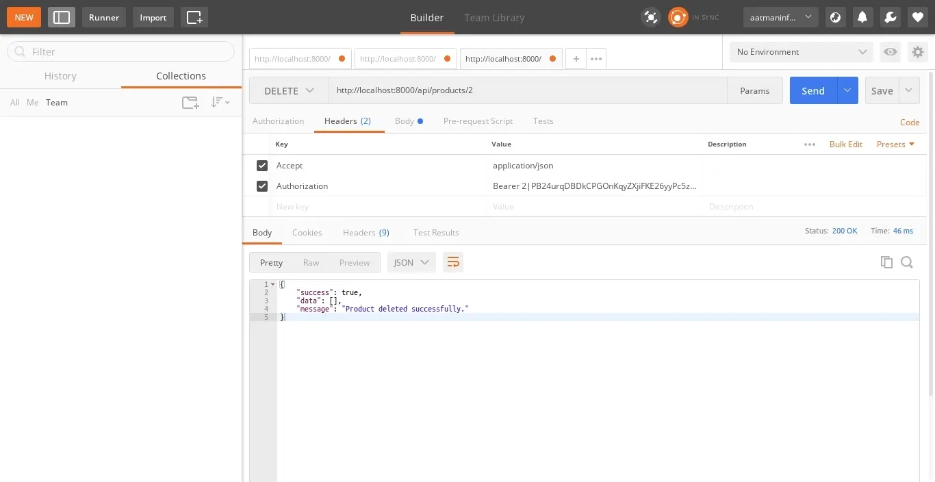 7) Product Delete API: Verb:DELETE, URL:http://localhost:8000/api/products/{id}