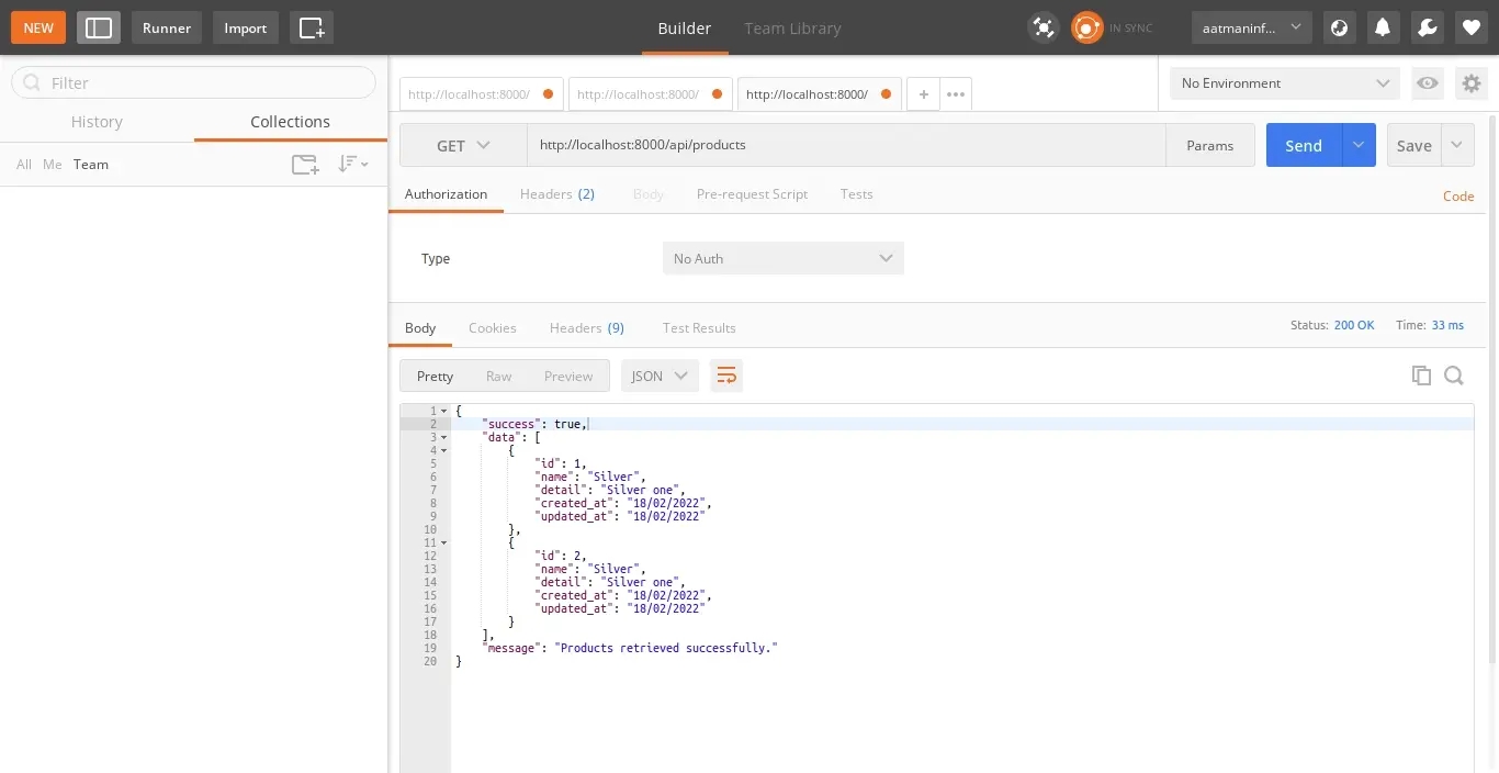 3) Product List API: Verb:GET, URL:http://localhost:8000/api/products