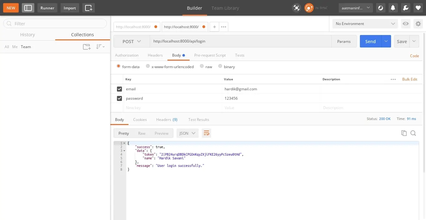 2) Login API: Verb:GET, URL:http://localhost:8000/api/login