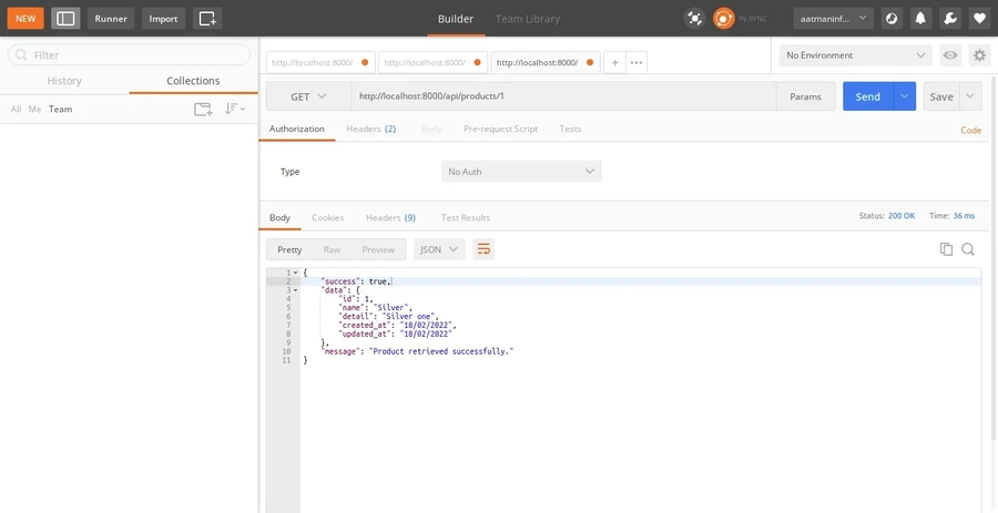 5) Product Show API: Verb:GET, URL:http://localhost:8000/api/products/{id}