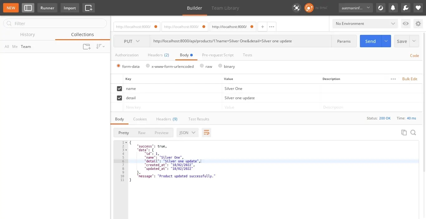 6) Product Update API: Verb:PUT, URL:http://localhost:8000/api/products/{id}