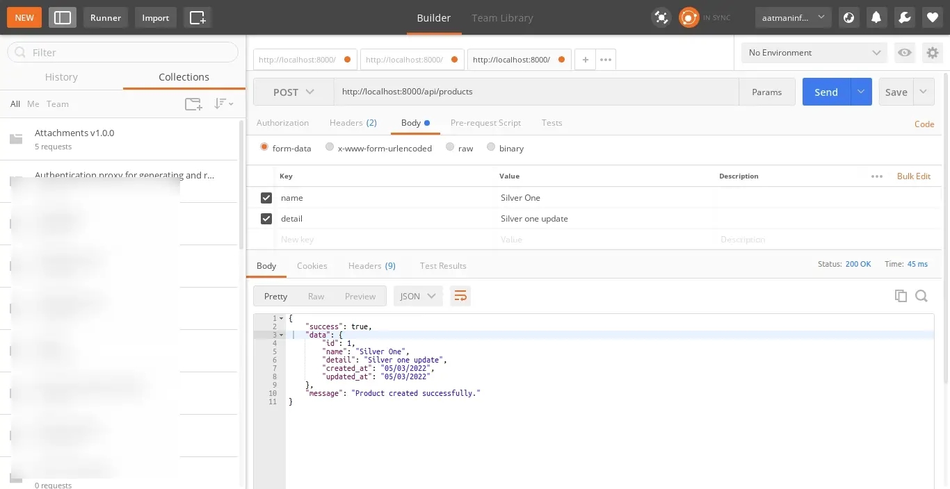 4) Product Create API: Verb:POST, URL:http://localhost:8000/api/products