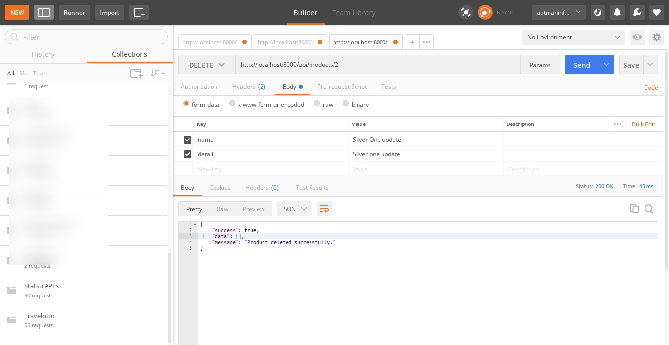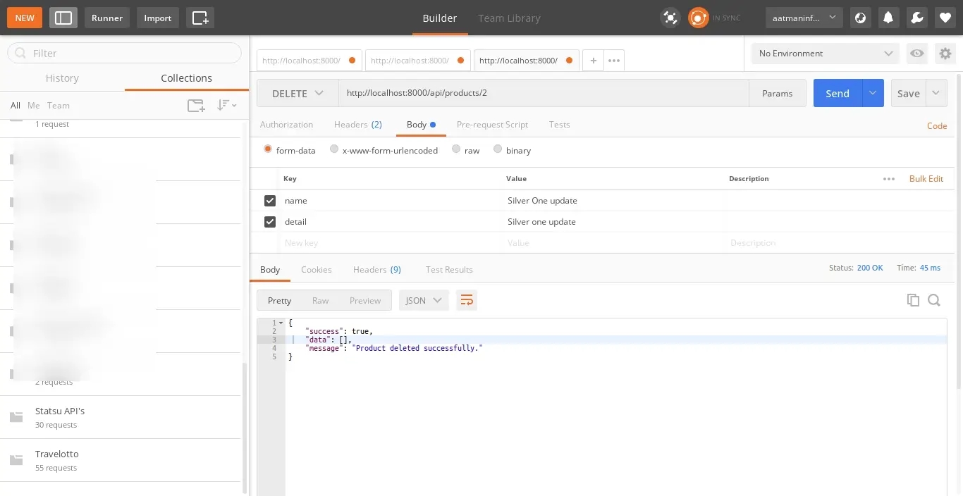 7) Product Delete API: Verb:DELETE, URL:http://localhost:8000/api/products/{id}