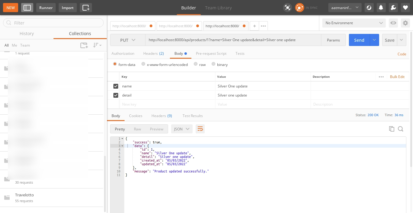 6) Product Update API: Verb:PUT, URL:http://localhost:8000/api/products/{id}