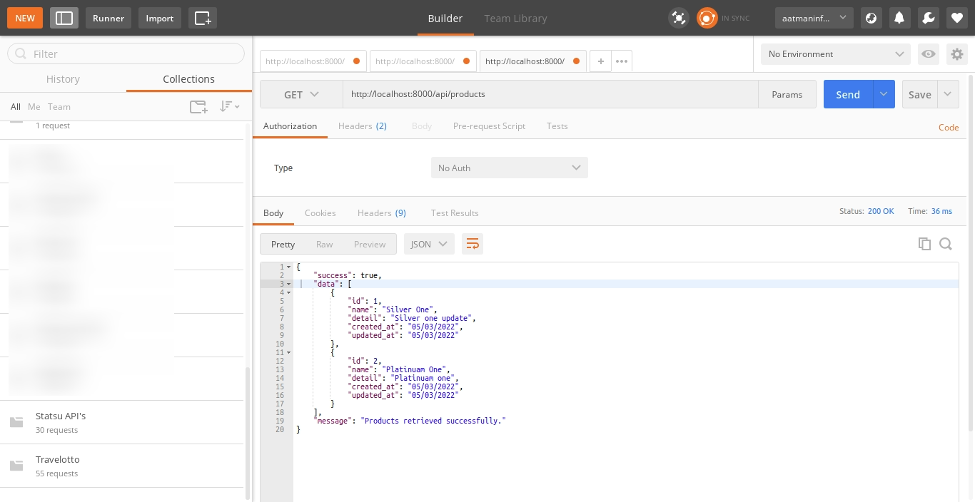 3) Product List API: Verb:GET, URL:http://localhost:8000/api/products