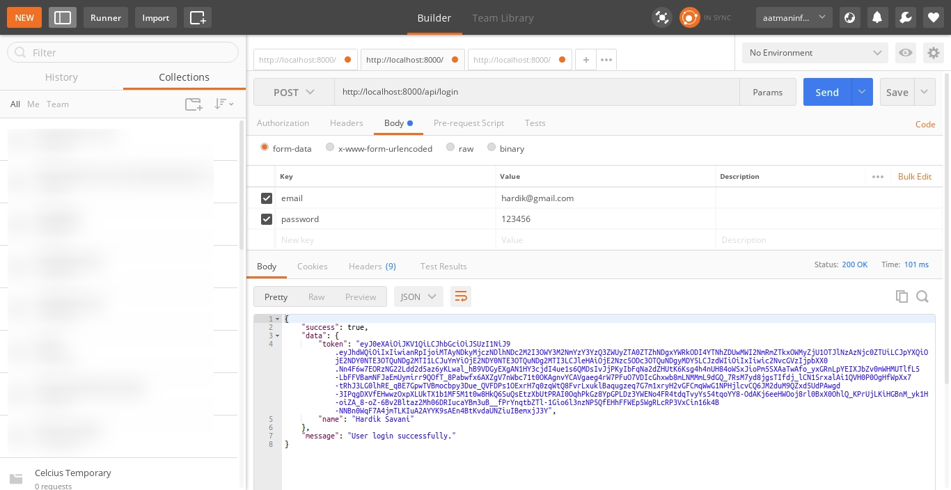 2) Login API: Verb:GET, URL:http://localhost:8000/api/login