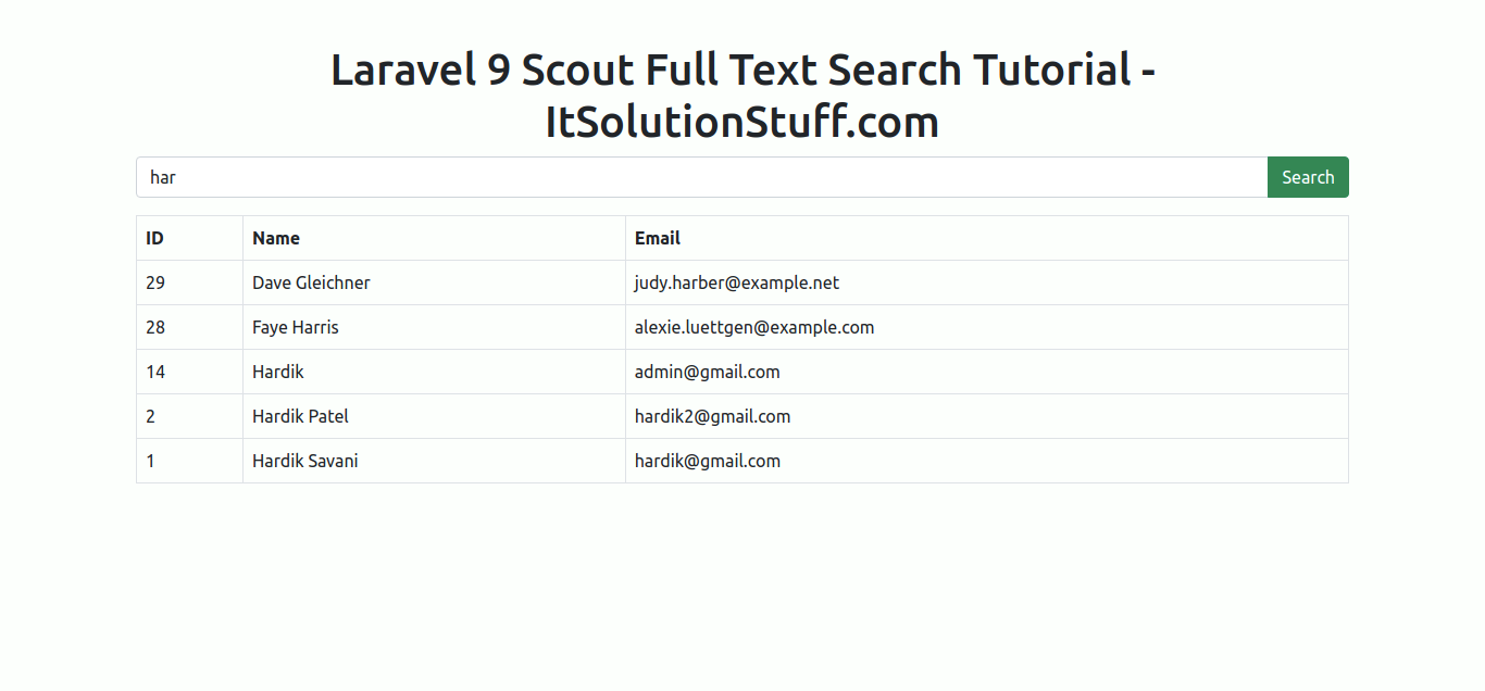 In this example, we will install the scout composer package and use the database driver for full text search. then we will use scout with User model and add a name, email, and id column for full text search. let's see the below step to create full text search function.