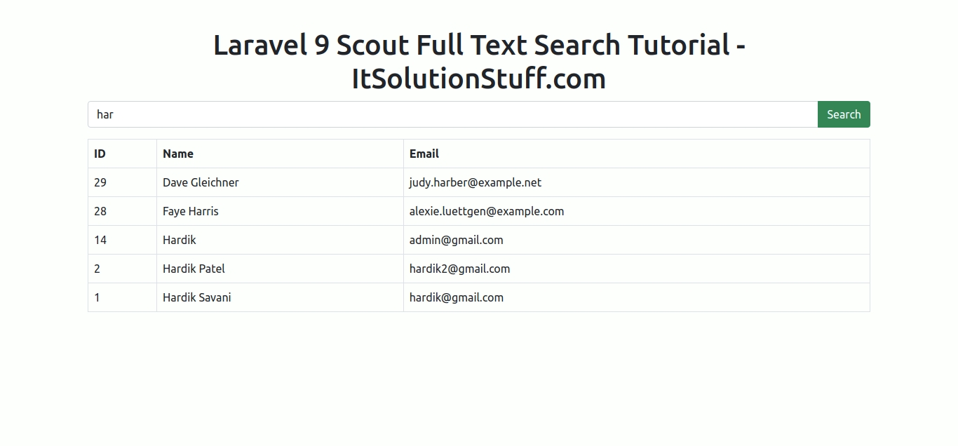 <!DOCTYPE html><html><head> <title>Laravel 9 Scout Full Text Search Tutorial - ItSolutionStuff.com</title> <link href="https://cdnjs.cloudflare.com/ajax/libs/twitter-bootstrap/5.0.1/css/bootstrap.min.css" rel="stylesheet"></head><body> <div class="container"> <h1>Laravel 9 Scout Full Text Search Tutorial - ItSolutionStuff.com</h1> <form method="GET"> <div class="input-group mb-3"> <input type="text" name="search" value="{{ request()->get('search') }}" class="form-control" placeholder="Search..." aria-label="Search" aria-describedby="button-addon2"> <button class="btn btn-success" type="submit" id="button-addon2">Search</button> </div> </form> <table class="table table-bordered data-table"> <thead> <tr> <th>ID</th> <th>Name</th> <th>Email</th> </tr> </thead> <tbody> @foreach($users as $user) <tr> <td>{{ $user->id }}</td> <td>{{ $user->name }}</td> <td>{{ $user->email }}</td> </tr> @endforeach </tbody> </table></div> </body> </html>Run Laravel App: