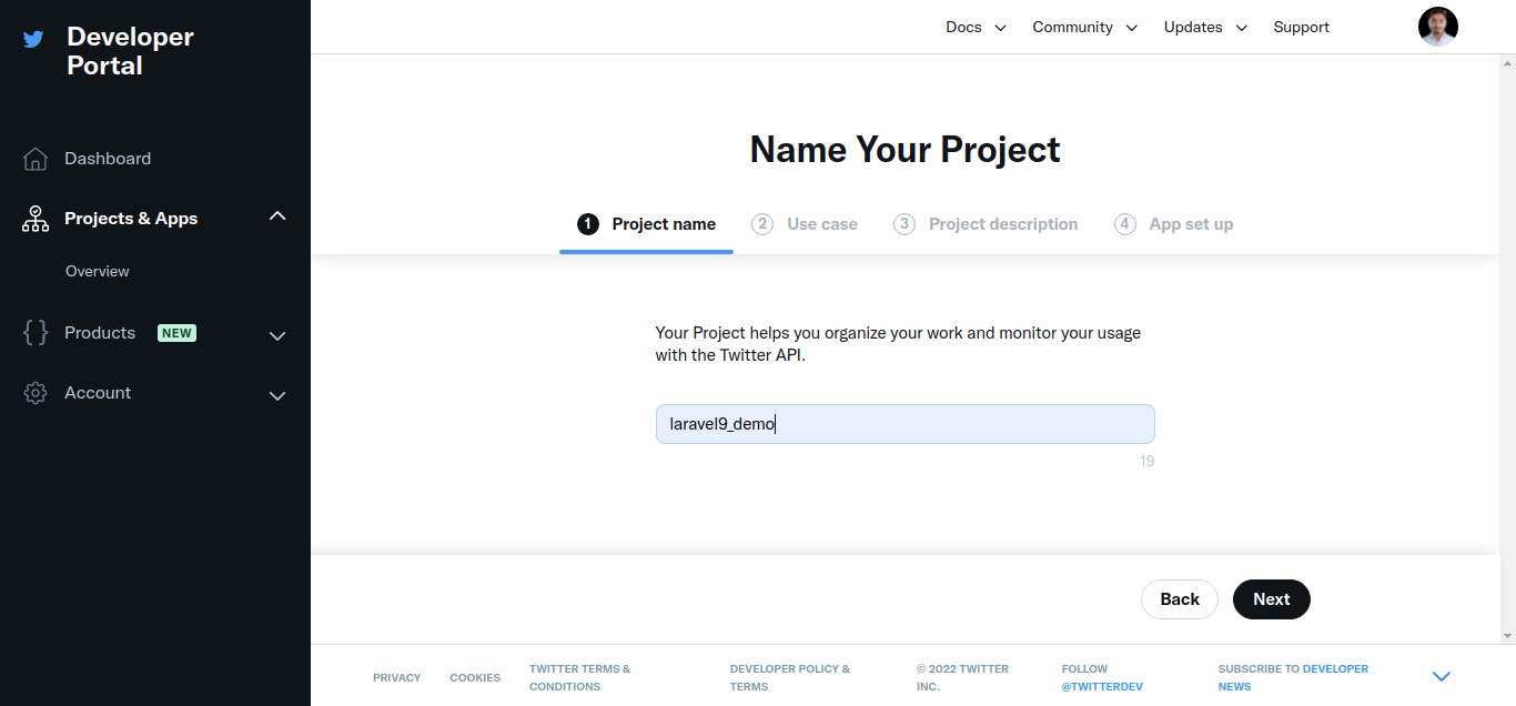 Go to Twitter Developer App to click here: https://developer.twitter.com/en/portal/projects-and-apps