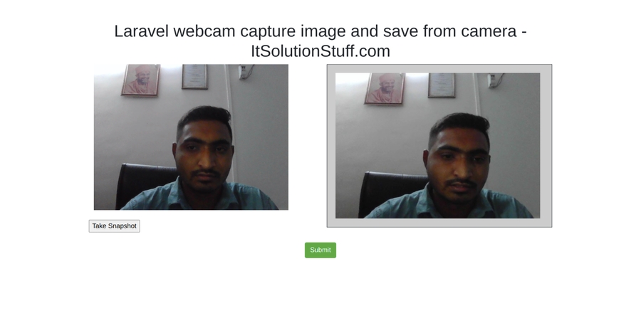 <!DOCTYPE html><html><head> <title>laravel webcam capture image and save from camera - ItSolutionStuff.com</title> <script src="https://cdnjs.cloudflare.com/ajax/libs/jquery/3.3.1/jquery.min.js"></script> <script src="https://cdnjs.cloudflare.com/ajax/libs/webcamjs/1.0.25/webcam.min.js"></script> <link rel="stylesheet" href="https://cdnjs.cloudflare.com/ajax/libs/twitter-bootstrap/4.1.3/css/bootstrap.min.css" /> <style type="text/css"> #results { padding:20px; border:1px solid; background:#ccc; } </style></head><body> <div class="container"> <h1 class="text-center">Laravel webcam capture image and save from camera - ItSolutionStuff.com</h1> <form method="POST" action="{{ route('webcam.capture') }}"> @csrf <div class="row"> <div class="col-md-6"> <div id="my_camera"></div> <br/> <input type=button value="Take Snapshot" onClick="take_snapshot()"> <input type="hidden" name="image" class="image-tag"> </div> <div class="col-md-6"> <div id="results">Your captured image will appear here...</div> </div> <div class="col-md-12 text-center"> <br/> <button class="btn btn-success">Submit</button> </div> </div> </form></div> <script language="JavaScript"> Webcam.set({ width: 490, height: 350, image_format: 'jpeg', jpeg_quality: 90 }); Webcam.attach( '#my_camera' ); function take_snapshot() { Webcam.snap( function(data_uri) { $(".image-tag").val(data_uri); document.getElementById('results').innerHTML = '<img src="'+data_uri+'"/>'; } ); }</script> </body></html>Run Laravel App:
