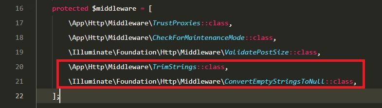 Mặc định thì Laravel đã kết nối hai middleware TrimStrings và ConvertEmptyStringsToNull trong ứng dụng. Các middleware này được liệt kê trong lớp App\Http\Kernel, cụ thể tại $middleware. Các middleware này có chức năng sẽ tự động trim tất cả các trường chứa chuỗi trên request, hơn thế nữa là chuyển đổi bất kỳ trường trống nào về giá trị null. Với nó, bạn sẽ không cần phải quá lo lắng về việc chuẩn hóa input trong route hay controller nữa.