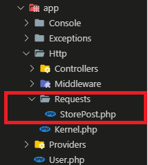 Lớp này sẽ tạo tự động ở thư mục app/Http/Requests, mặc định thì thư mục này không tồn tại, nó sẽ tự động tạo trong khi chạy lệnh Artisan trên.