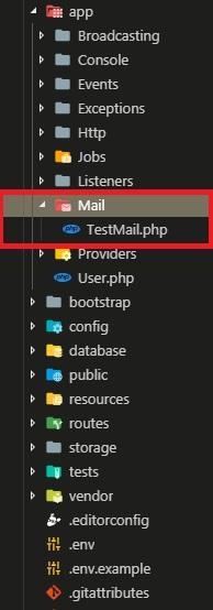 Nghe tên cũng đủ hiểu chức năng của thư mục Mail này. Thư mục Mail chứa tất cả các lớp đại diện cho từng email. Các mail object này gói gọn các xử lý của việc xây dựng email trong một class đơn giản, có thể gửi bằng Mail::send.