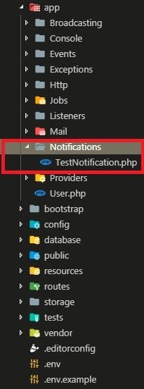 Dễ hiểu là thư mục này chứa các class cho việc thông báo các hoạt động của ứng dụng, chẳng hạn như thông báo đơn giản về các event đã xảy ra trong ứng dụng. Tính năng này thông qua nhiều driver khác nhau như SMS, email, Slack hoặc lưu trữ trong database.