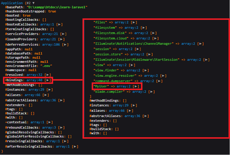Ngoài ra, trong tham số Closure của method extend, ngoài nhận biến chứa binding thì nó còn nhận biến thứ hai đó là $app giúp chúng ta có thể linh hoạt trong quá trình code.