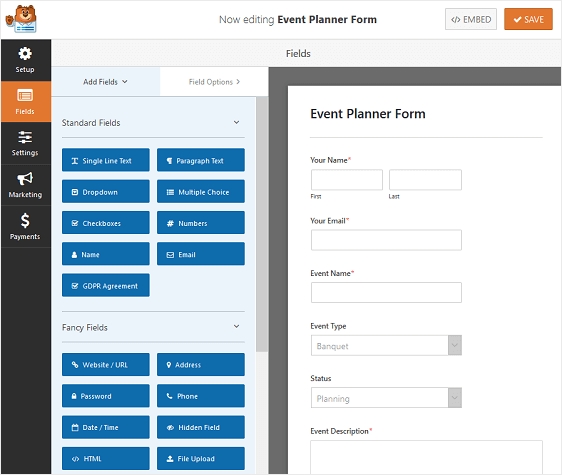 This saves you the time needed to manually add event planner fields to a simple contact form.