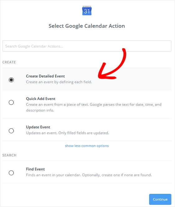 You’ll then select a Google Calendar action. Since we are looking to add events to Google Calendar from form entries, we’ll click on the Create Detailed Event option.