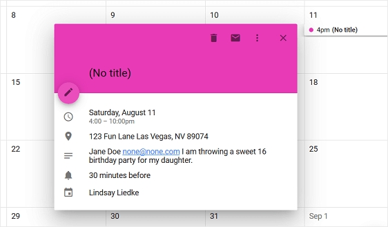 Notice that the information filled out on the WordPress form is now in our Google Calendar, complete with date, time, address, name, email, and comment or message.