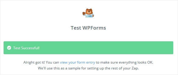 Zapier will run a test on your WordPress form to make sure everything is set up correctly and that you have at least one test entry present. You will see a success message if you have done everything right up until this point.