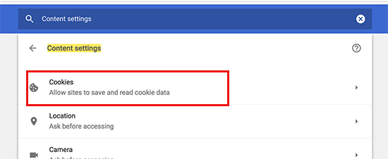 Under content settings, you will need to click on ‘Cookies’ to open the cookies settings page.