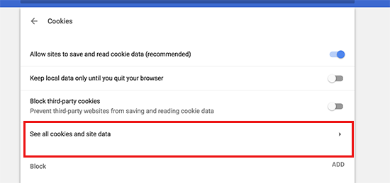 Next, you need to click on the ‘All cookies and site data’ option.