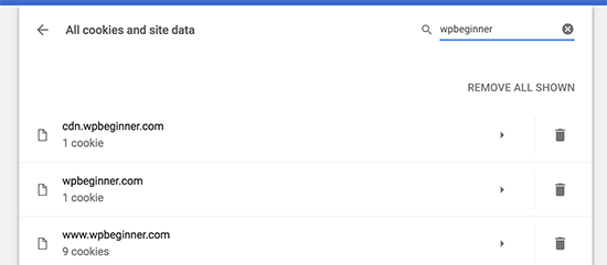 On the next page, you will see a list of all cookies and site data stored on your browser by all websites you visited.