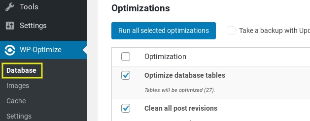 Once you install and activate the plugin, it will add a WP-Optimize menu item to your WordPress dashboard. To delete post revisions, you can navigate to WP-Optimize > Database.