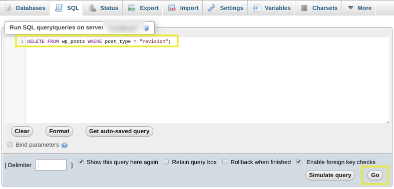 DELETE FROM wp_posts WHERE post_type = "revision";Make sure to replace wp_ with your own WordPress database prefix. Then click on the Go button. This will initiate the command: